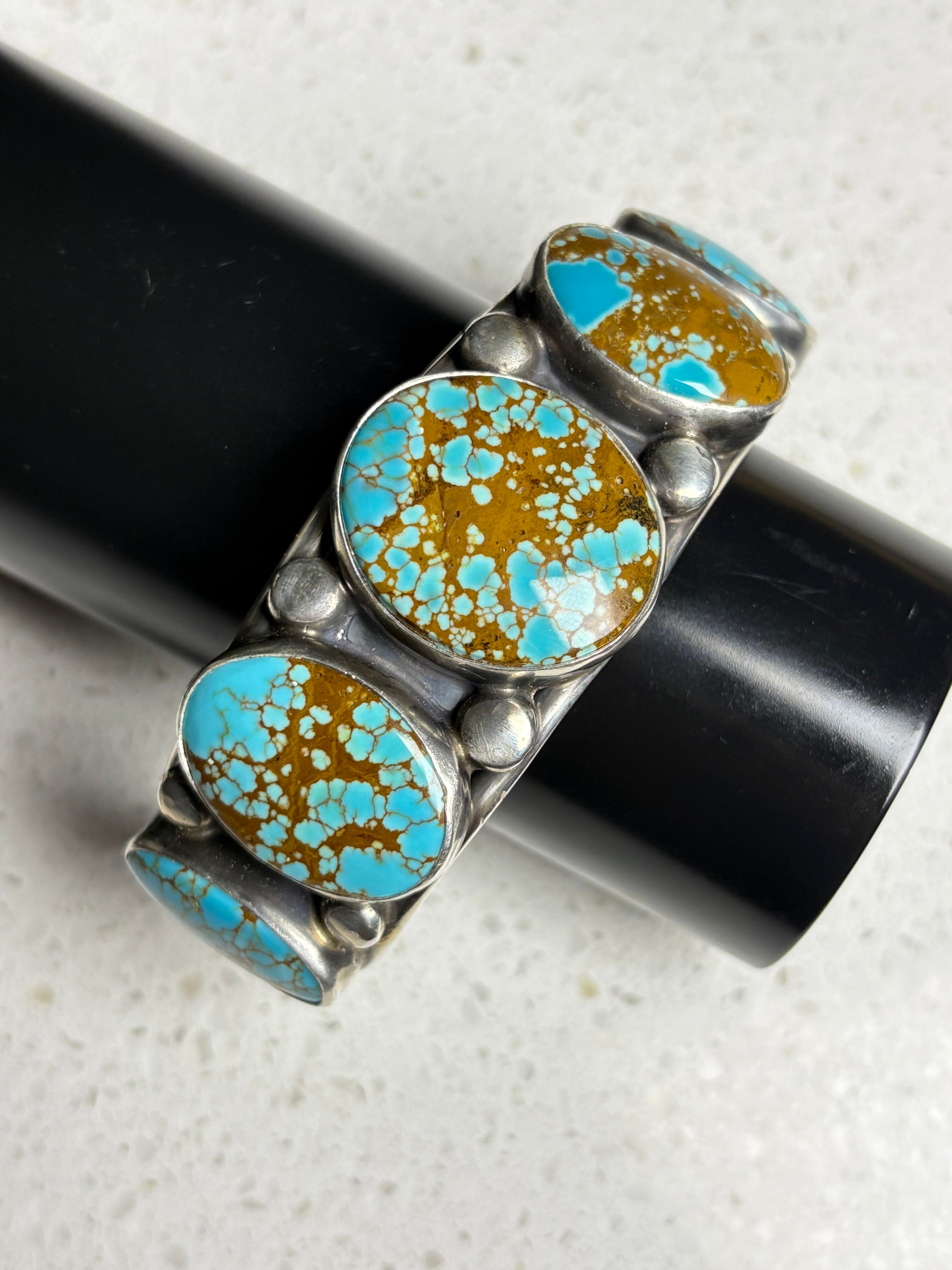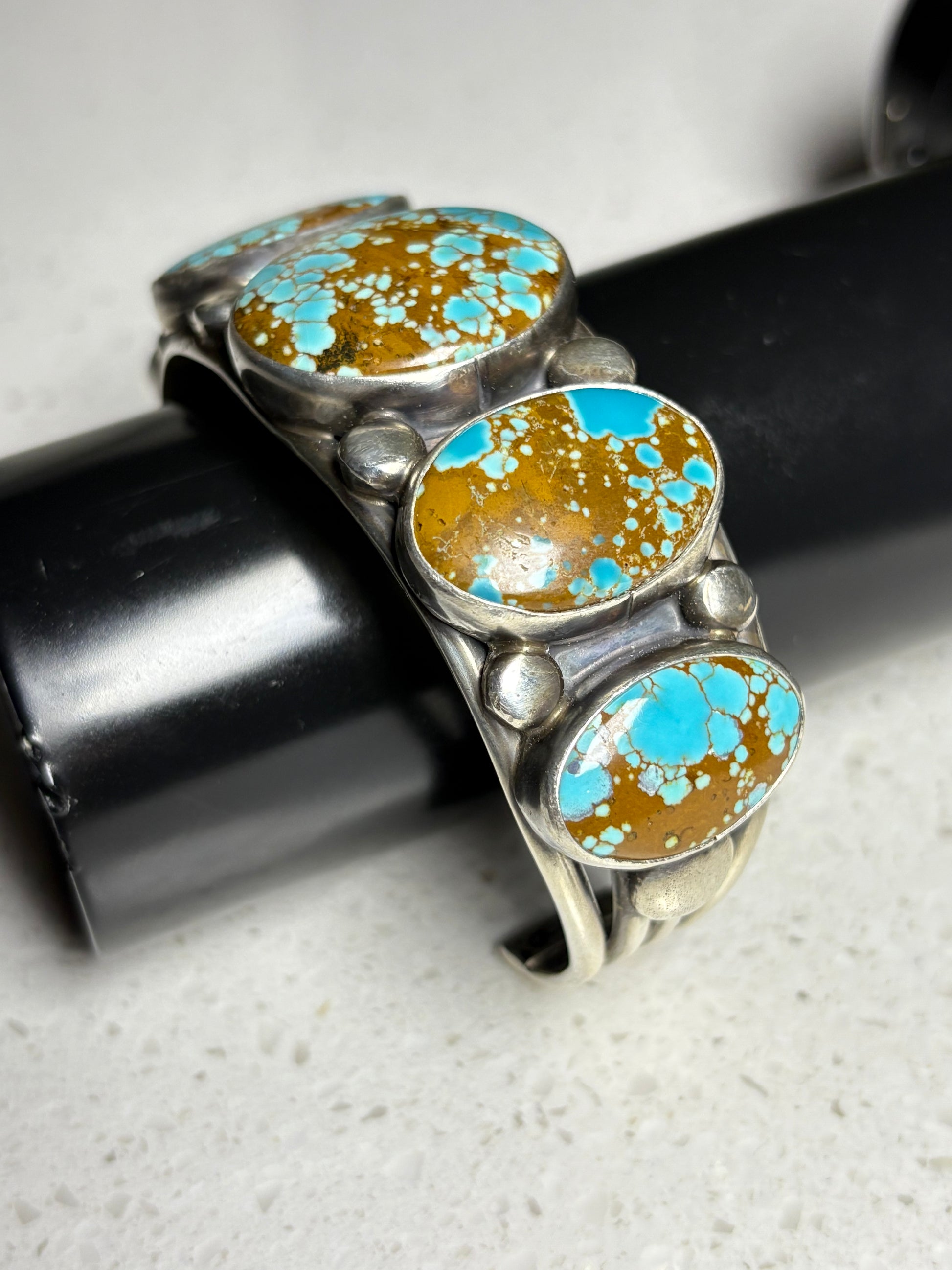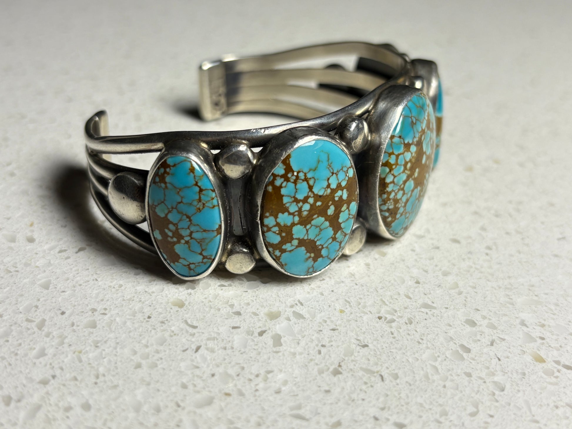 This beautifully handcrafted bracelet features Number Eight turquoise, celebrated for its vibrant blue tones and distinctive golden-brown matrix. Signed by a skilled Navajo silversmith Vordy, this piece embodies authentic Southwestern craftsmanship.