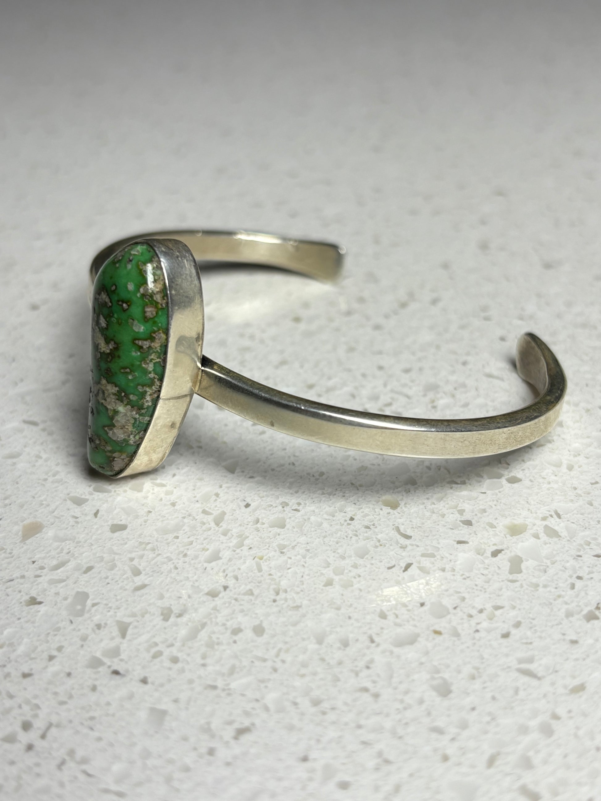 This handcrafted bracelet by Navajo silversmith M features a striking Sonoran Gold turquoise stone known for its vivid green hues and natural golden matrix. Perfect for everyday wear or as a standout addition to any turquoise collection.