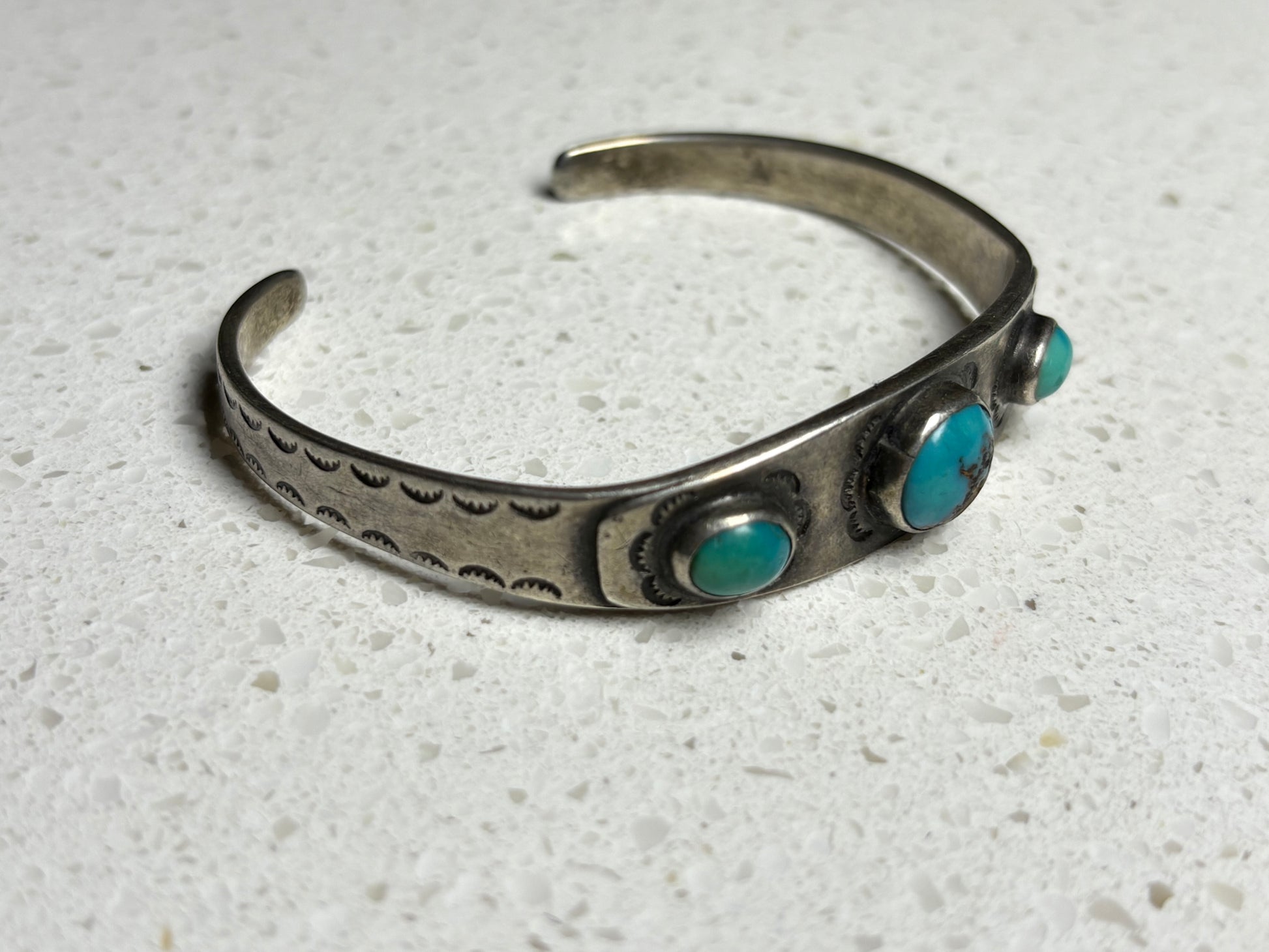 This vintage 1960s bracelet features a stunning Bisbee turquoise stone measuring 8 x 8 mm, set in a classic Navajo sterling silver design. Lightweight and versatile, it’s perfect for everyday wear or as part of a turquoise collection.