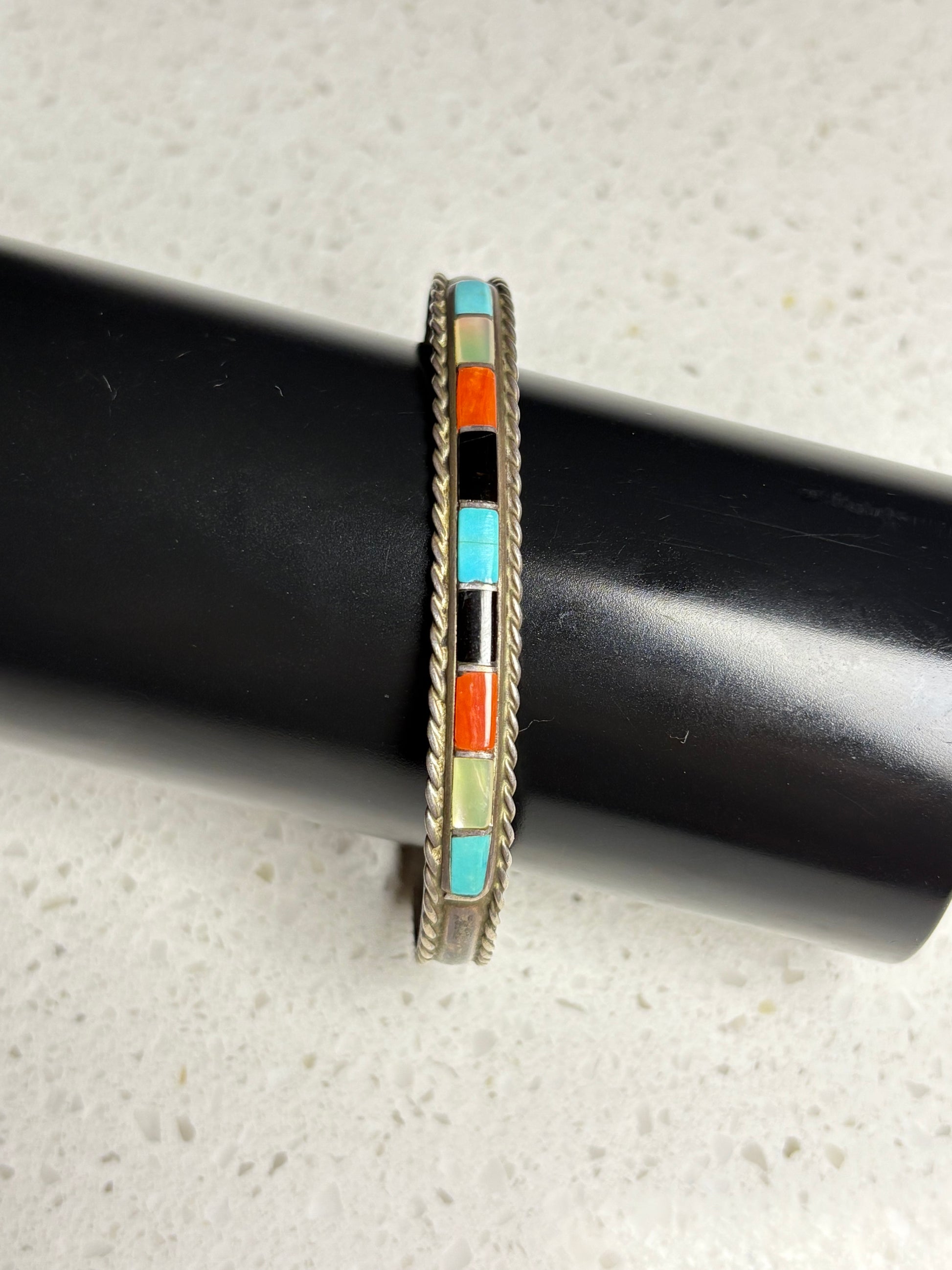 This vintage Navajo bracelet from the 1980s features a multi-stone inlay design, blending a variety of natural stones in a classic Southwestern style. Handcrafted and signed by silversmith JP, this lightweight piece is perfect for daily wear or adding a touch of vintage charm to any jewelry collection.